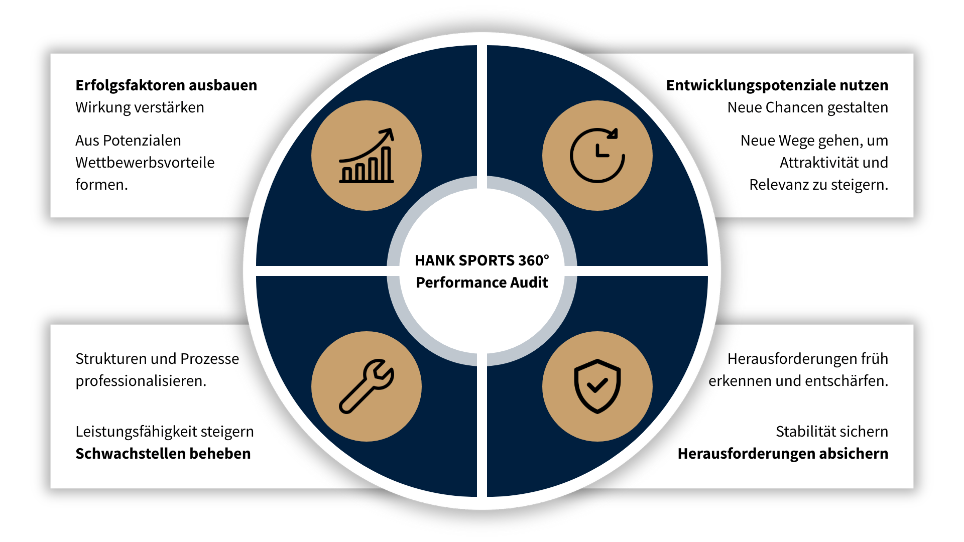 Mit dem HANK SPORTS 360° Performance Audit erhalten Sie eine fundierte Standortbestimmung als Fundament für die nächsten Entscheidungen: